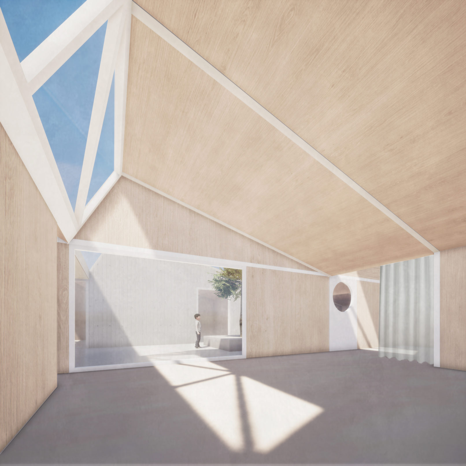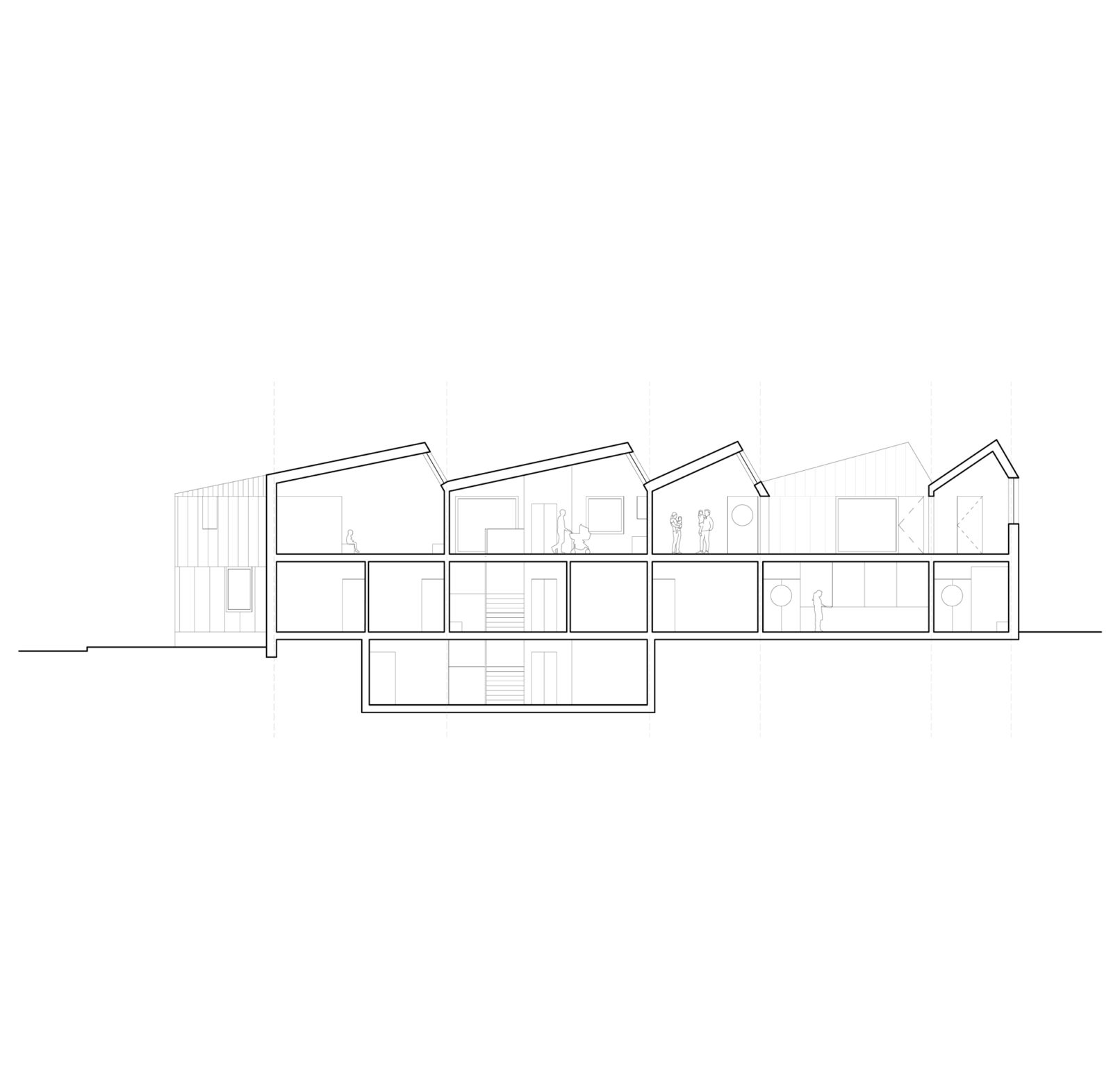 The new construction of the nursery reinforces the existing axes and alignments of the surrounding urban landscape through its volume. A compact volume distributes the program spaces on two floors, liberating the maximum space in front on the north of the site of the plot. A new public space is thus created becoming a public square. The idea was to establish a dialogue between the village and the existing public facilities on the plot, a transition between the two-sided roofs of the village and the flat roofs of the public equipment on the west materialized through a toothed roof . The new building thus limits the impact of construction on the site and gives the new volume on a more domestic scale.