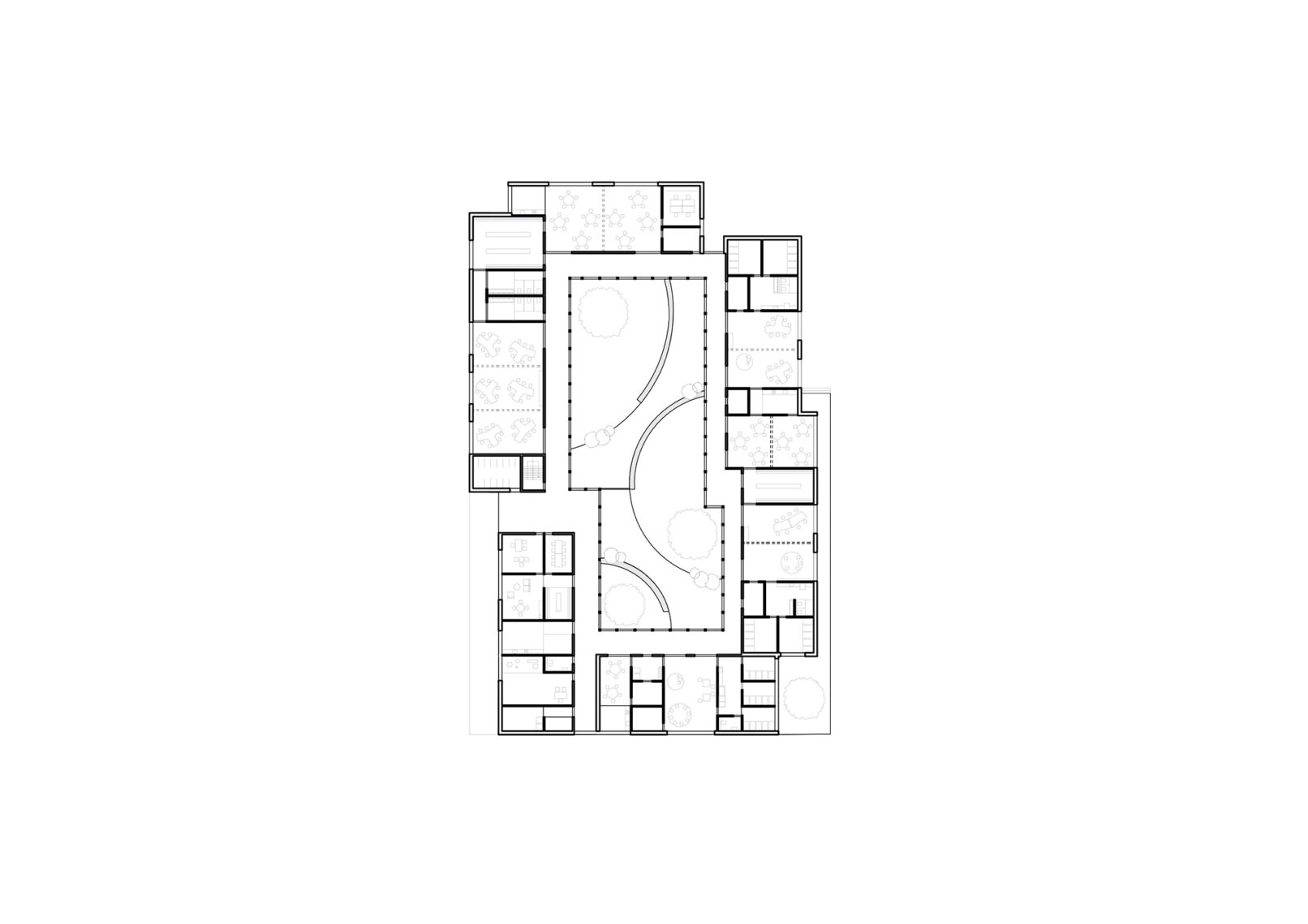 The UAPE and nursery programs are distributed around a central patio in a single volume while maintaining a well-differentiated separation of spaces. The entrance and access to each unit are clearly indicated by the volume and allow a functional optimization of both programs. The reception unit and administration areas are located on the south side, close to the public acces, closing the courtyard to create a secure area entirely dedicated to children.