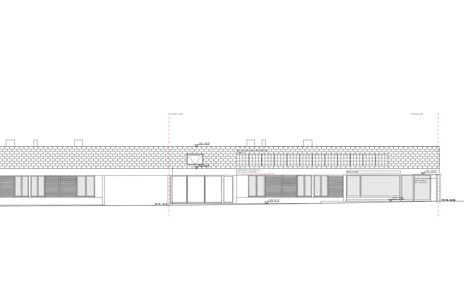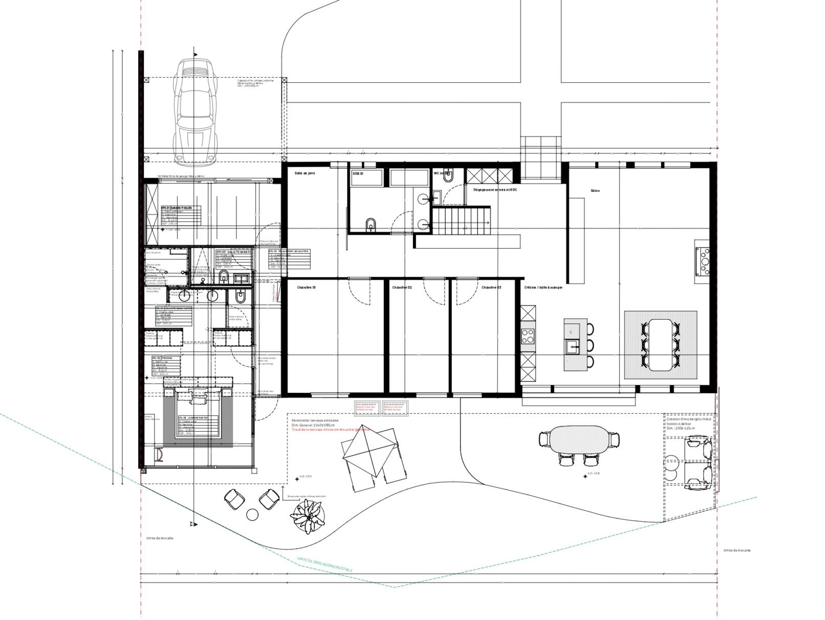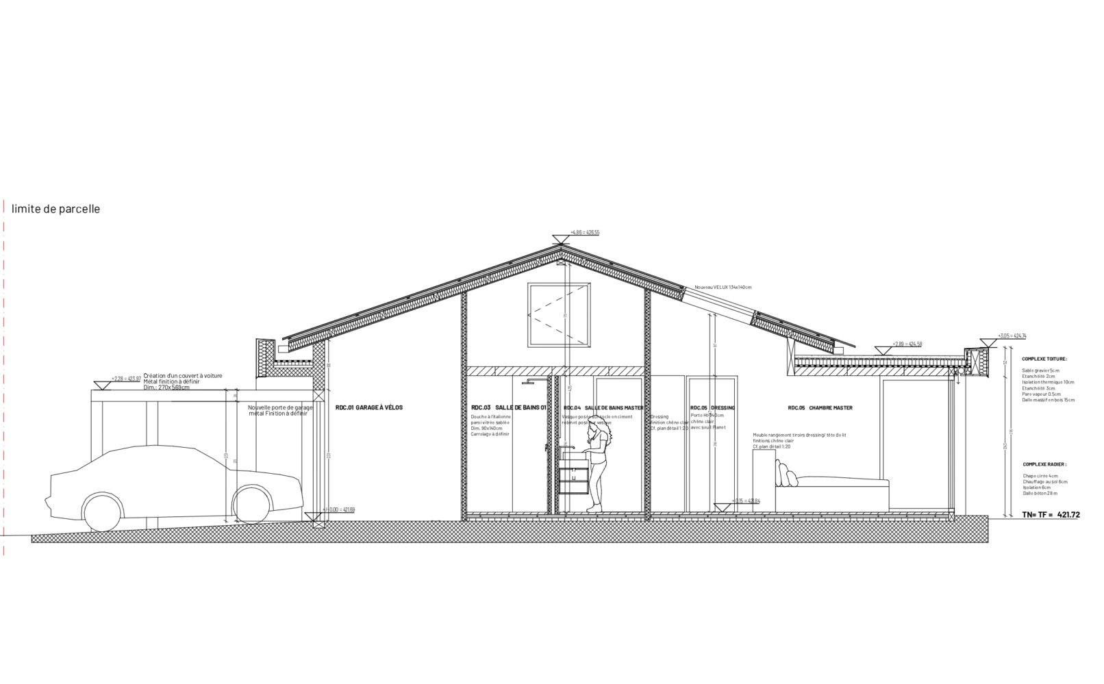 In a neighborhood of contiguous villas on one floor, the project proposes an extension of the ground floor against the property line. The linear plan is transformed into an L-shaped typology by offering a new master bedroom and two new bathrooms. A bicycle garage closes the house on the road side and gives privacy to the entire program. The exterior fittings have been completely redone, adapting with their organic lines to the construction limit of the river. The roof is modified to bring natural light over the imposing span depth. The volume of the extension is made entirely of wood, with a frame made of massive slabs which rests on the party walls. The interior is resolved with a central block which accommodates the equipment and sanitary facilities, providing a view of the house over the garden. The materiality of this oak block contrasts with stone details, light walls and a polished concrete floor.