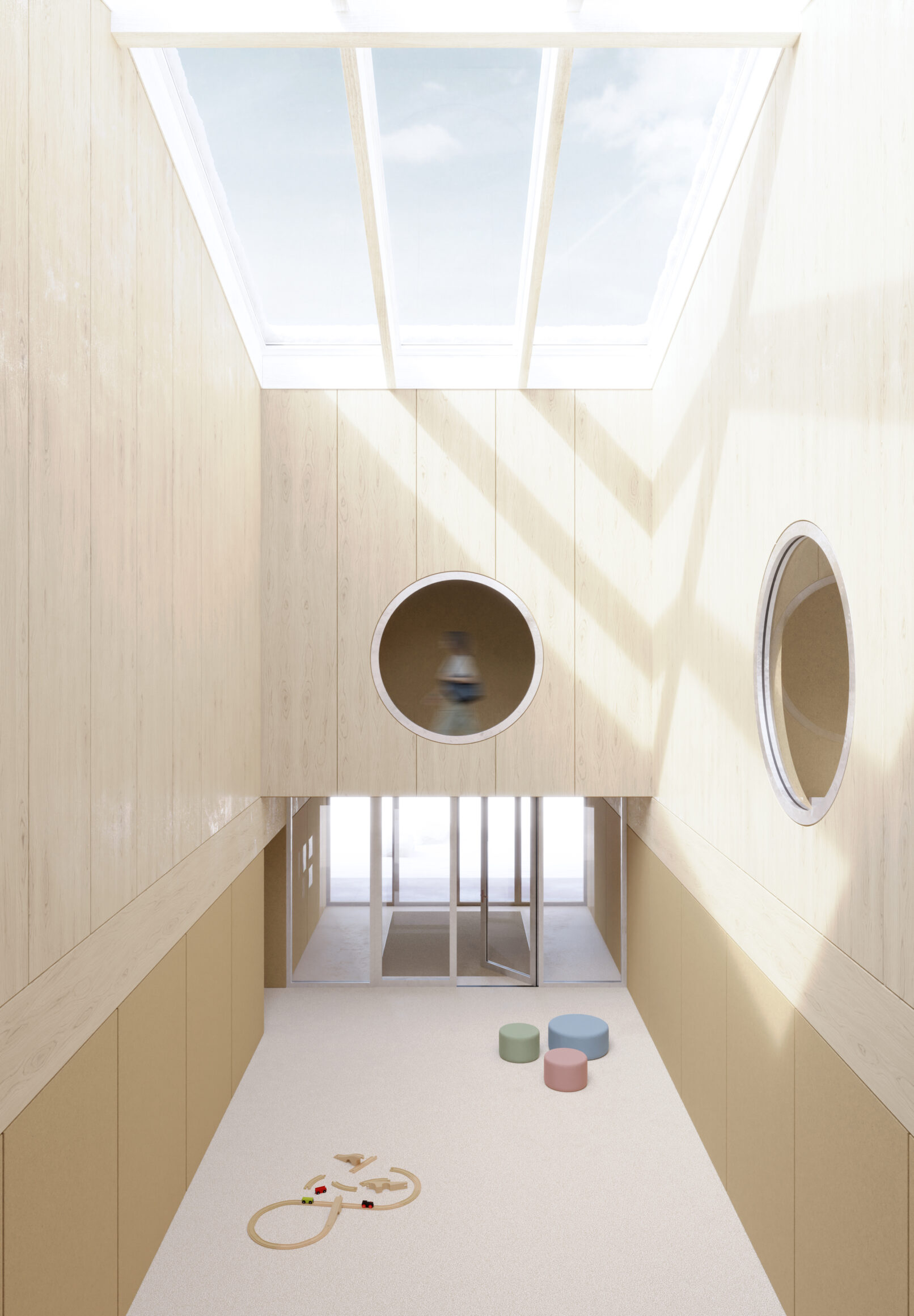 La forma del volumen propuesto delimita claramente dos nuevos espacios públicos, uno al oeste delimitando un perímetro seguro para los más pequeños y el acceso principal al programa del centro de salud orientado al este con voluntad de lugar público. La volumetría de los espacios interiores gira en torno a un espacio de circulación central, un atrio que permite una conexión visual de los dos programas manteniendo una separación física entre los espacios educativos y médicos. Este último ofrece una conexión vertical entre las diferentes unidades del programa que quiere resaltar la diversidad del programa propuesto.