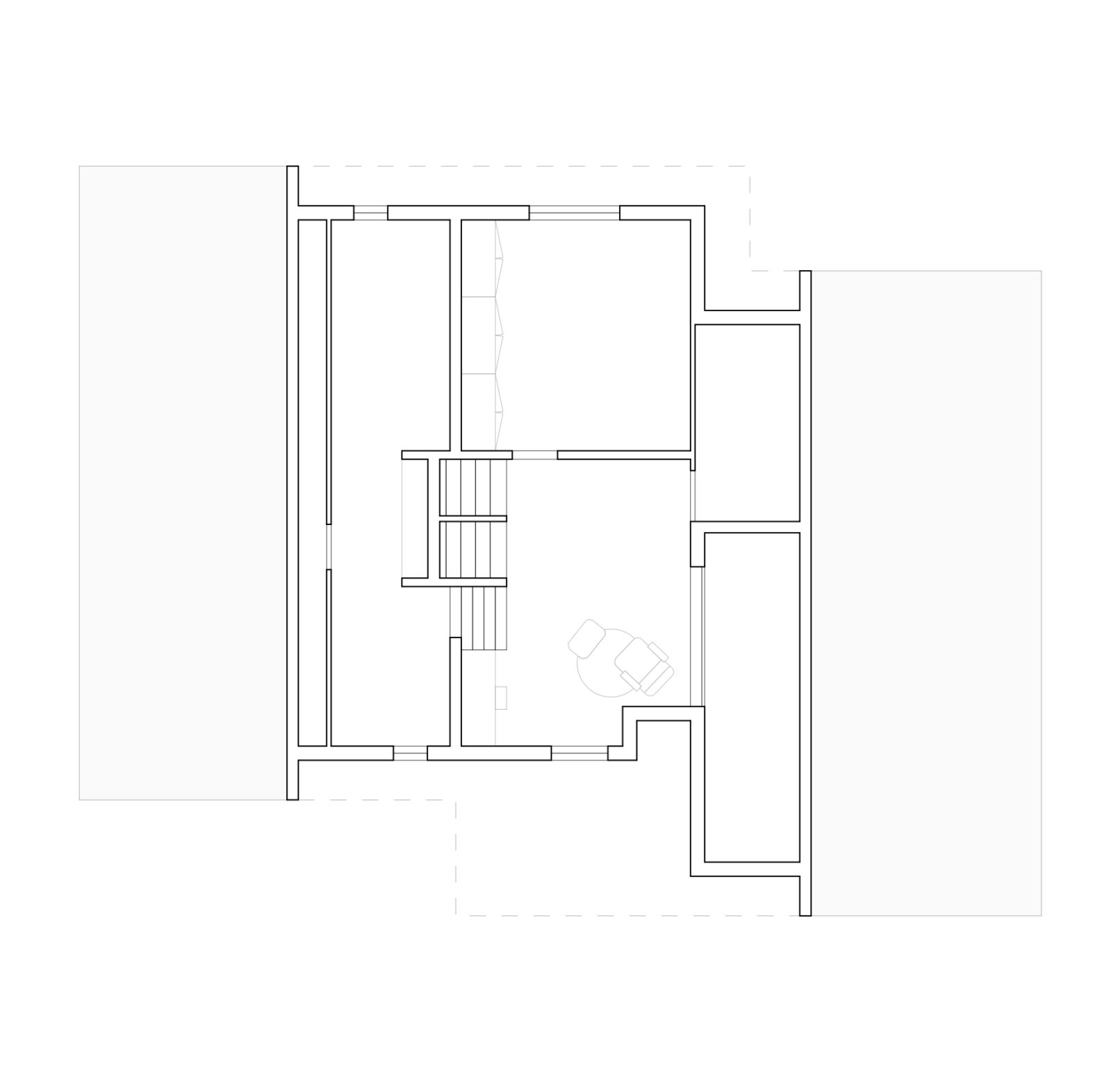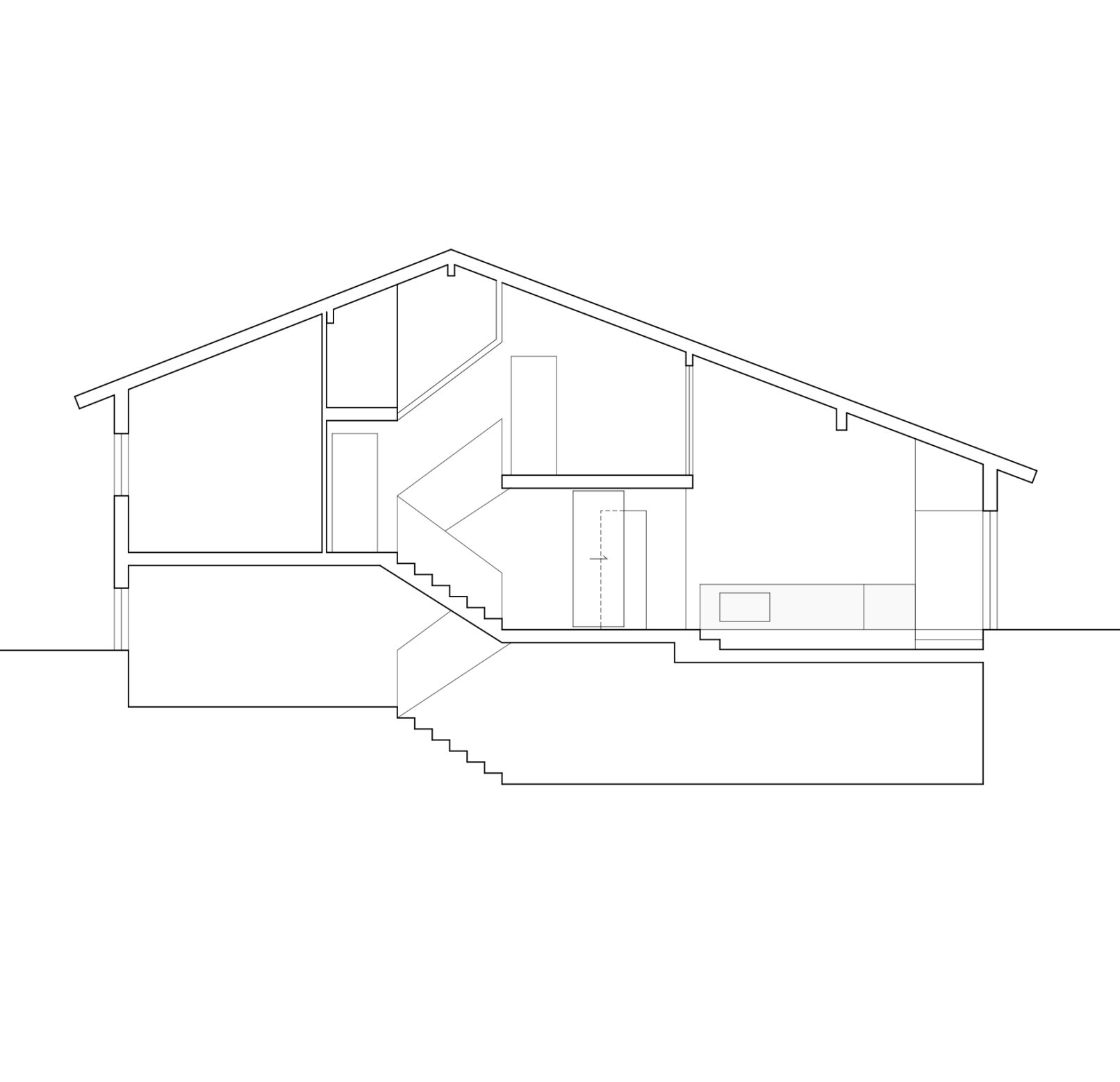 A complete abstraction of the existing space, we simply kept the memory of the wood as connector with history and the different interventions in the house. A single fluid space defines the ground floor, differentiating rooms marked by geometry and light. A visual continuity through spaces between three floors connected by a large window that appears as the protagonist over the living room. A new fireplace volume and central staircase ensure vertical visual and programmatic connection.
